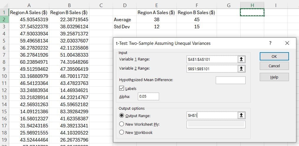 Select Region A sales as Variable 1 and Region B sales as Variable 2.