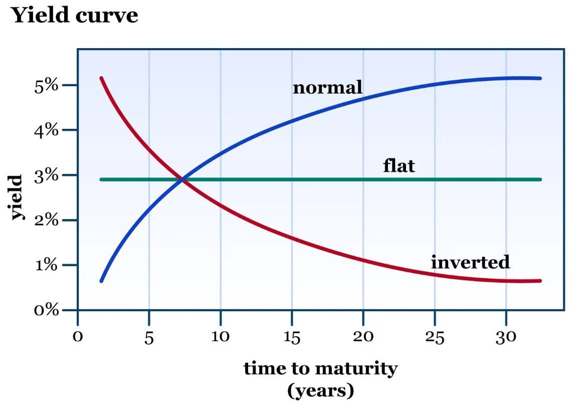 Inverted (Downward-Sloping): Short-term yields > long-term yields (e.g., negative spread).