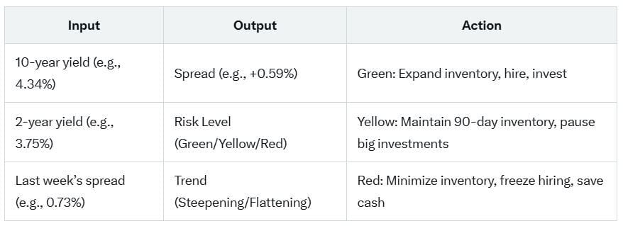 Track the Trend: Compare weekly spreads to detect steepening (optimistic) or flattening/inverting (pessimistic).