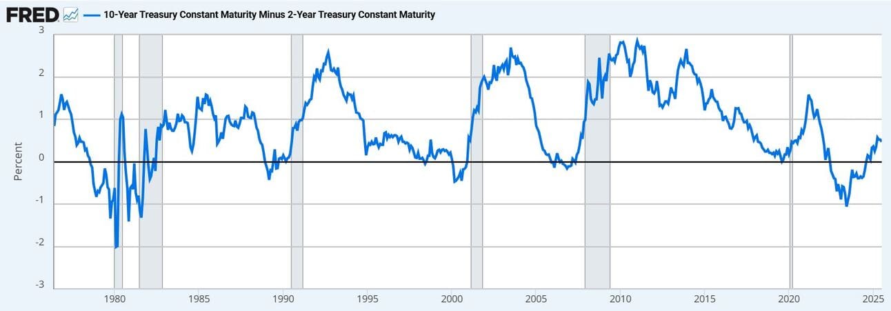 2-year yield = 3.75%, 10-year yield = 4.34% (FRED, July 7, 2025).