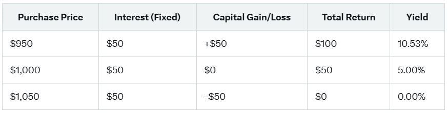Yield = (Coupon Payment + Capital Gain/Loss) ÷ Purchase Price